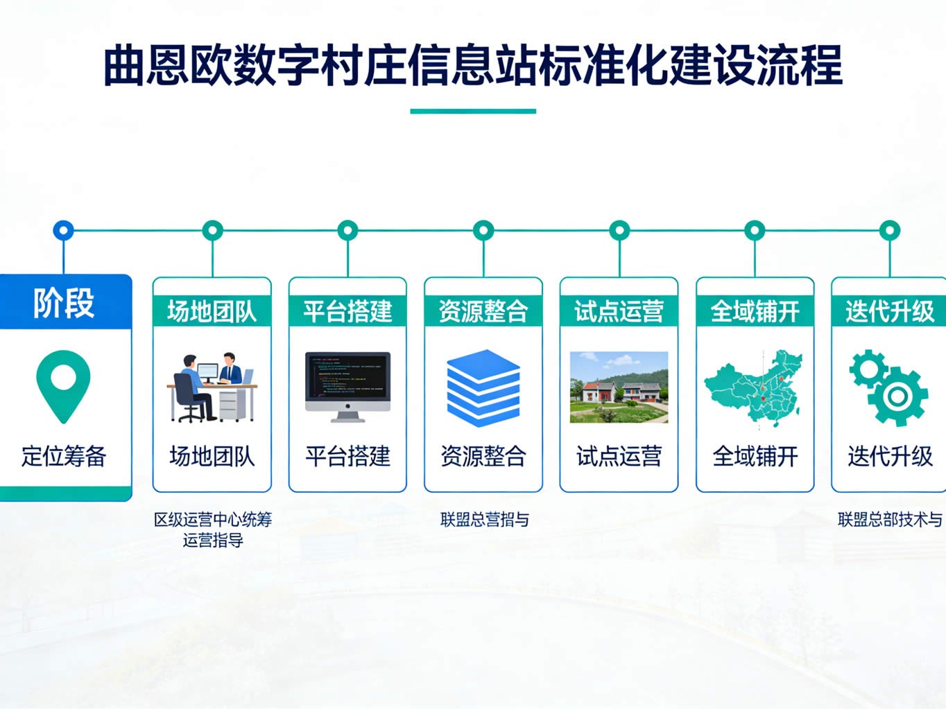 曲恩欧数字村庄信息站采用“定位筹备—场地团队—平台搭建—资源整合—试点运营—全域铺开—迭代升级”的标准化、阶梯式建设流程,分阶段推进、分步落地,全程由区级运营中心统筹、联盟总部提供技术与运营指导,降低建设难度、确保建设成效,贴合数字乡村建设的分步推进要求与信息入村工程规范,具体分为六个阶段: