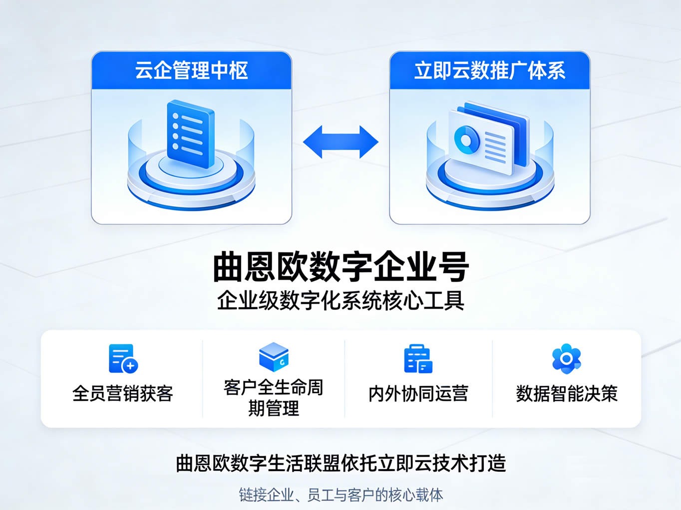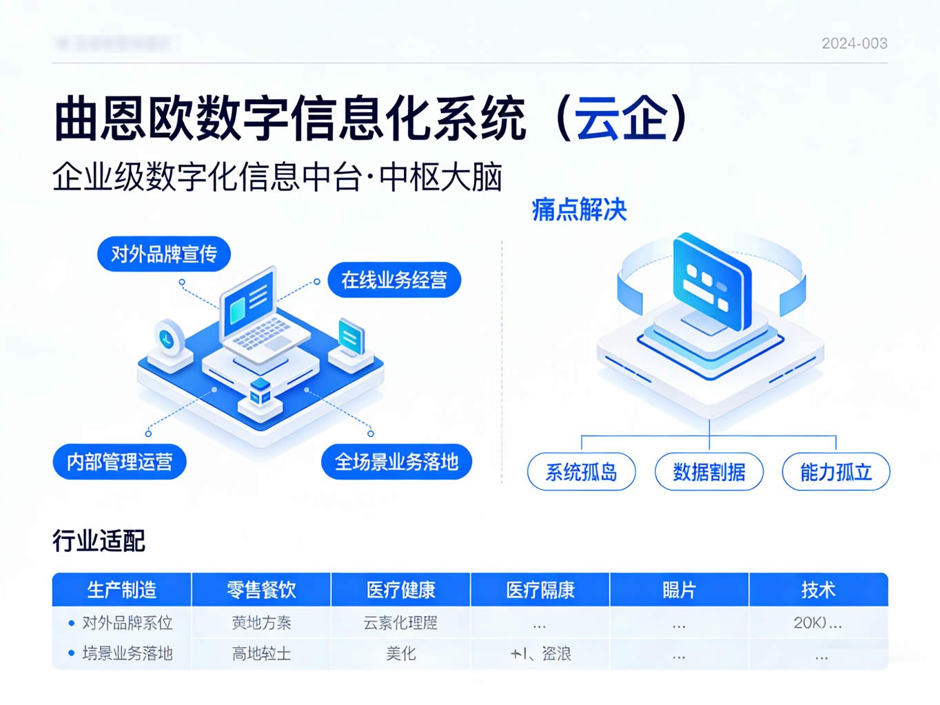 曲恩欧数字信息化系统(云企),是曲恩欧数字生活联盟依托立即云数技术打造的全链路企业数字化转型解决方案,是企业级的数字化信息中台,更是企业数字化经营的「中枢大脑」。它并非单一功能软件,而是将企业对外品牌宣传、在线业务经营、内部管理运营、全场景业务落地的所有需求,整合到一个统一平台的综合性系统,从根源上解决企业数字化转型中「系统孤岛、数据割据、能力孤立」的三大核心痛点,适配生产制造、零售餐饮、医疗健康等数十个行业的上百个业务场景。