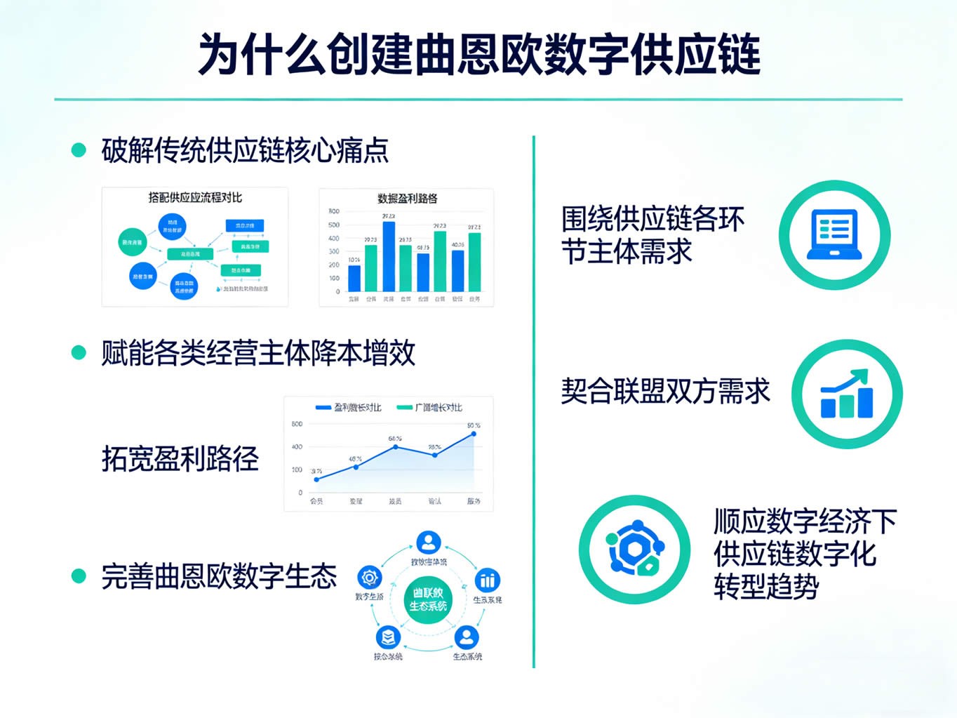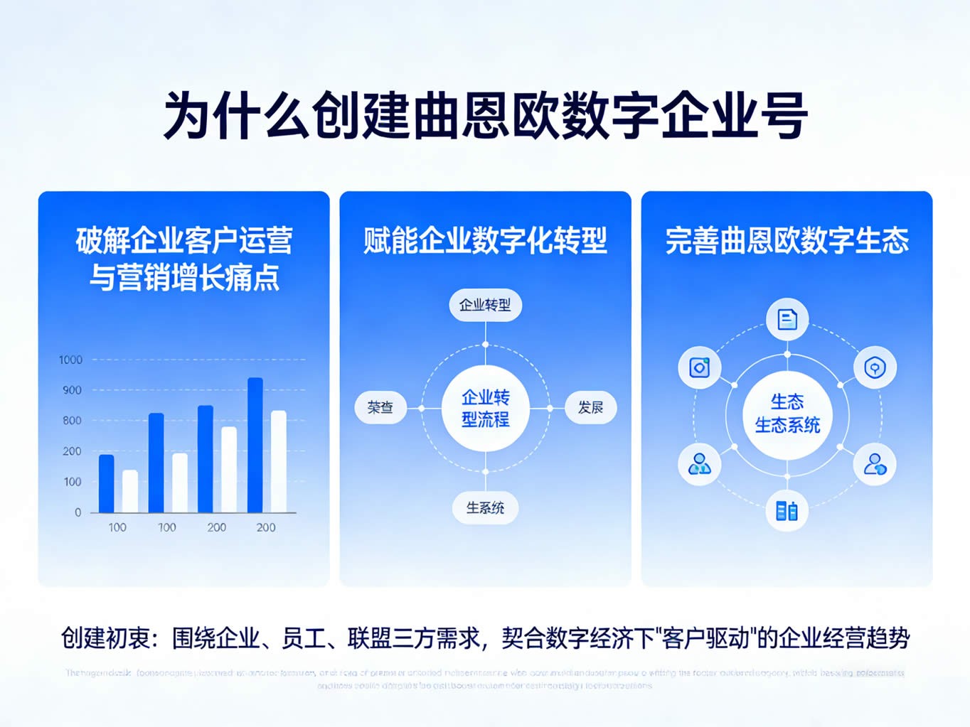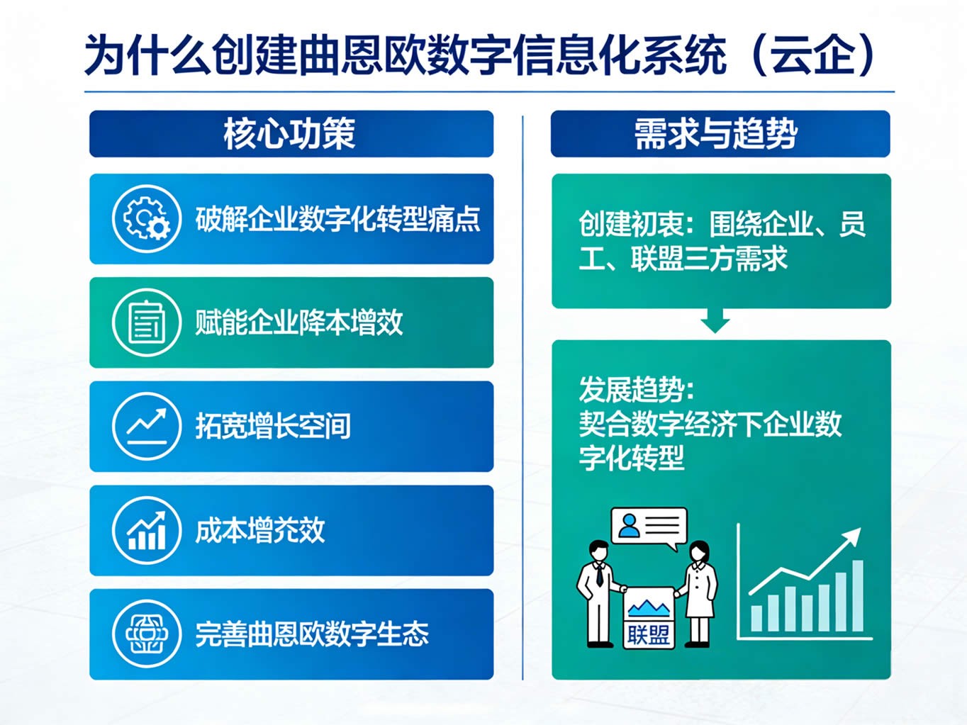 创建曲恩欧数字信息化系统(云企),是破解企业数字化转型痛点、赋能企业降本增效、拓宽增长空间、完善曲恩欧数字生态的核心举措,其创建初衷围绕企业、员工、联盟三方需求,同时契合数字经济下企业数字化转型的发展趋势,具体如下: