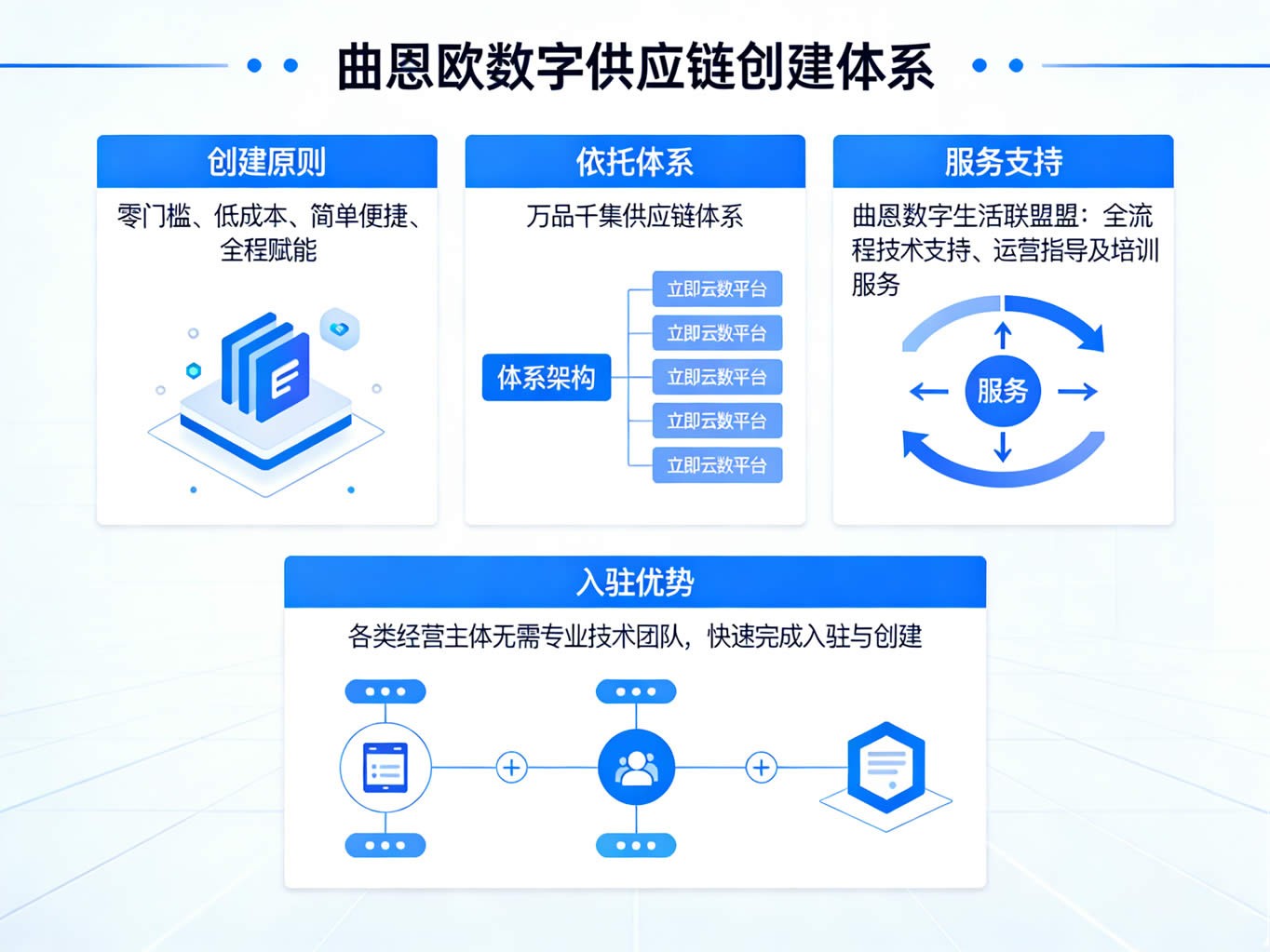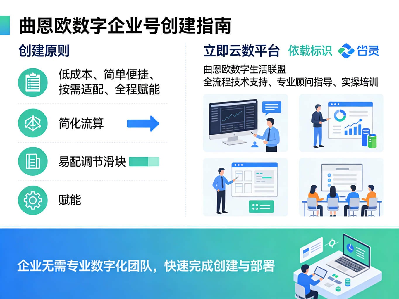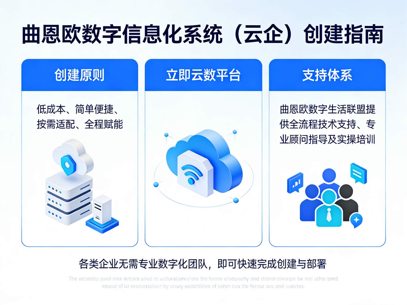 曲恩欧数字信息化系统(云企)的创建以“低成本、简单便捷、按需适配、全程赋能”为原则,依托立即云数平台,由曲恩欧数字生活联盟提供全流程技术支持、专业顾问指导及实操培训,各类企业无需专业数字化团队,即可快速完成创建与部署,具体创建方法如下: