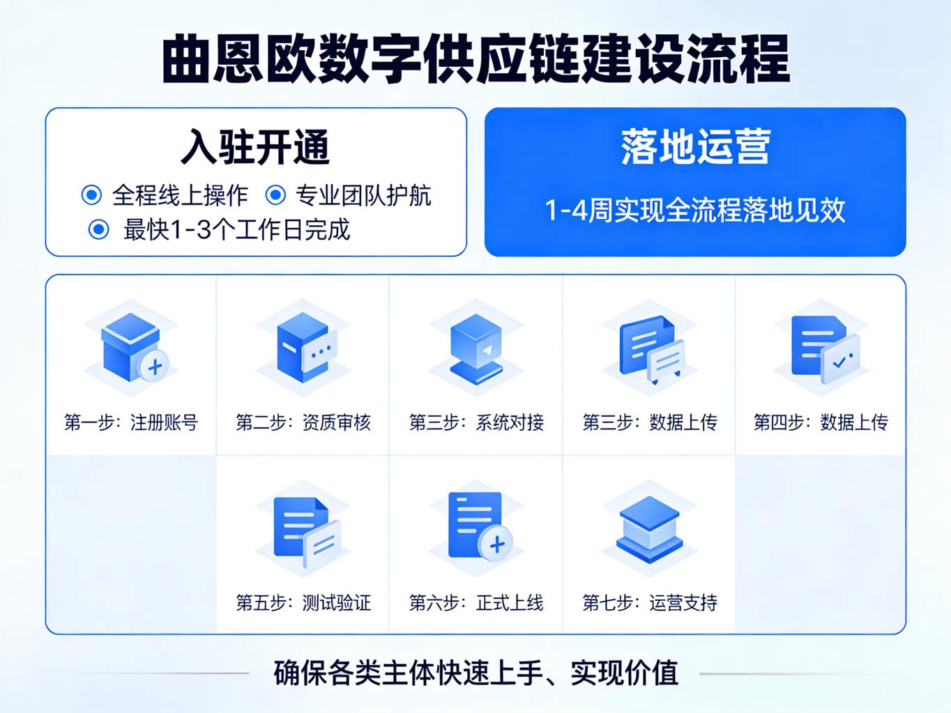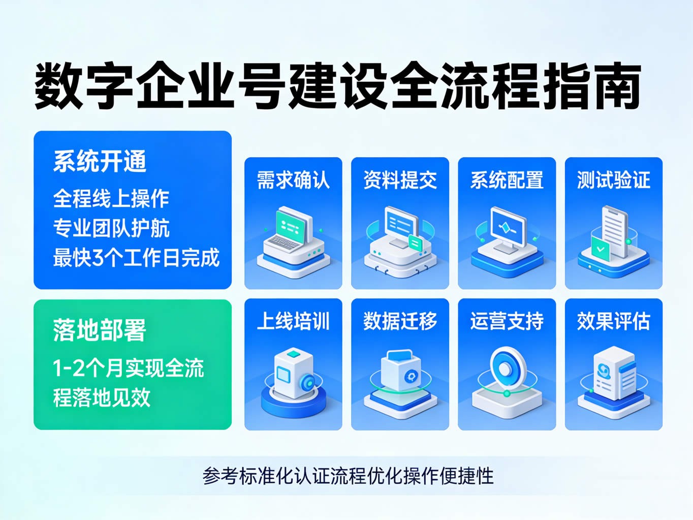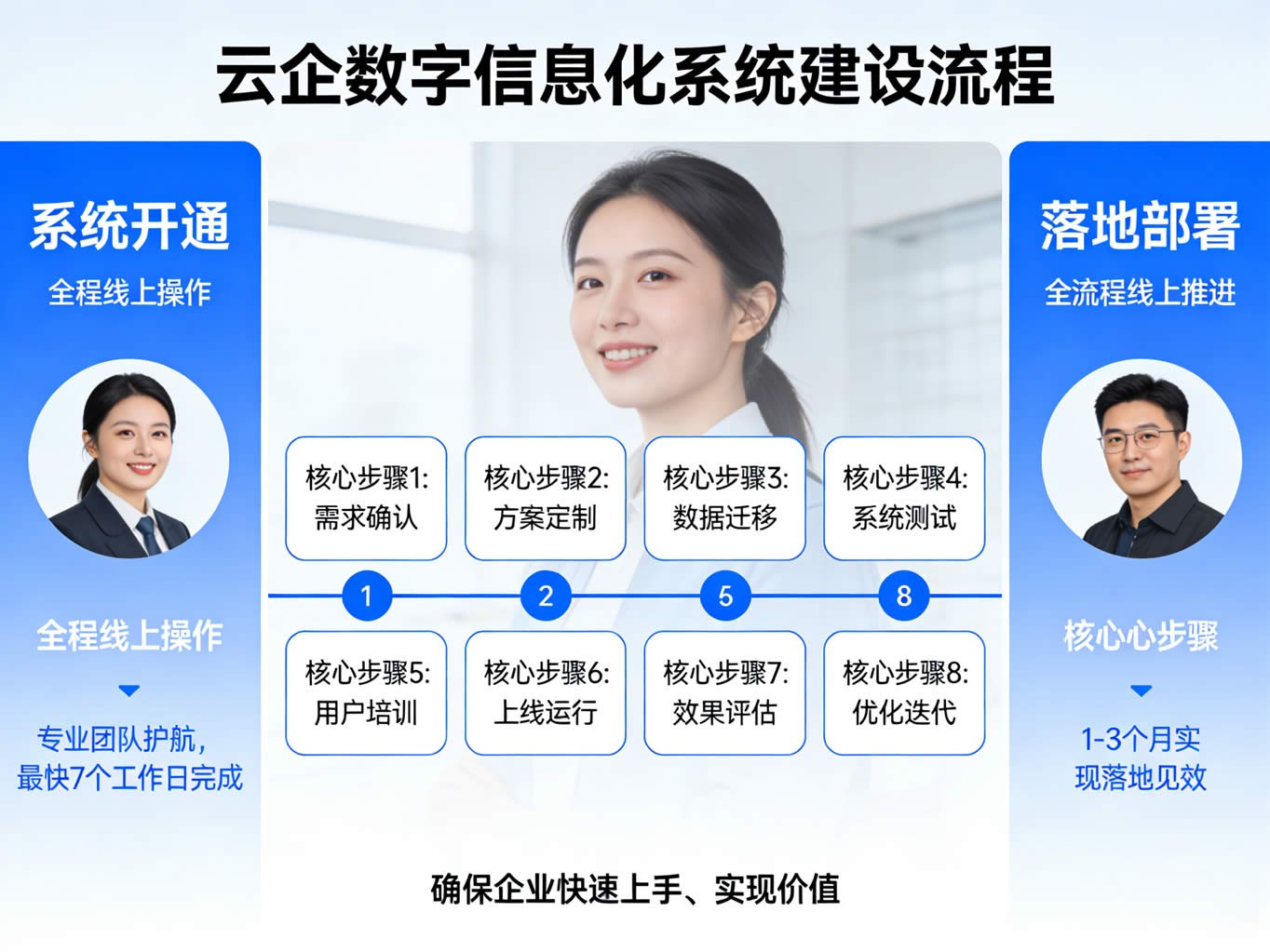 数字信息化系统(云企)的建设流程分为“系统开通”与“落地部署”两大阶段,全程线上操作、专业团队护航,最快7个工作日即可完成系统开通,1-3个月实现全流程落地见效,具体流程分为8个核心步骤,确保企业快速上手、实现价值: